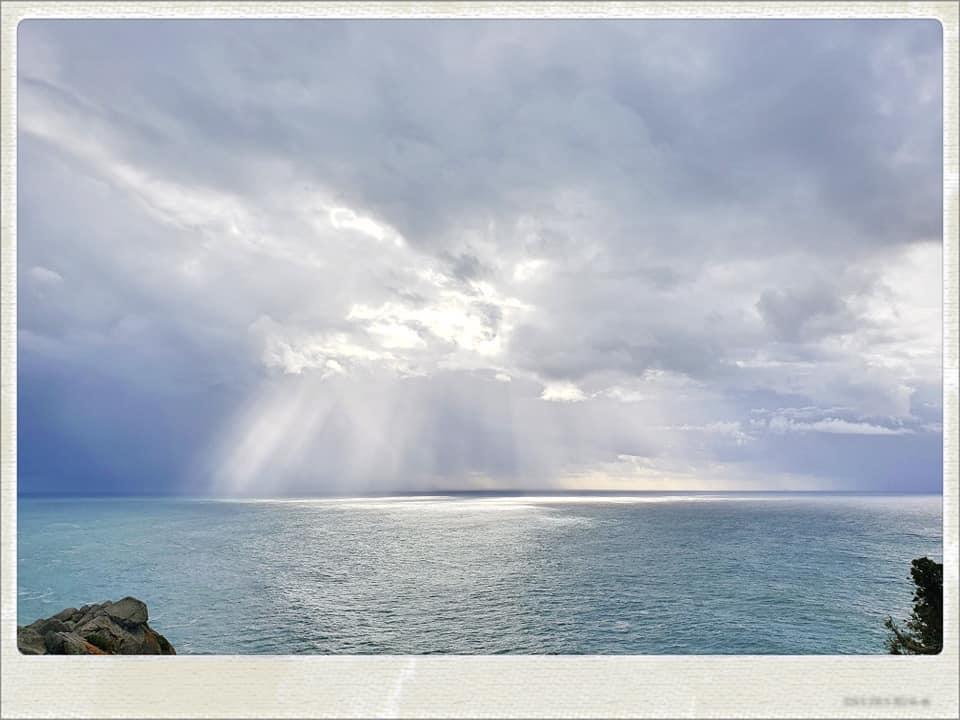 The setting sun grew so huge as soon as itโd broken through the fluffy clouds. Whenever I turned my head for the panoramic view of the beach, I was dazzled by the strong sunlight.